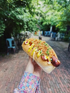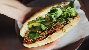 Szarpana kaczka, sos hoi sin orzechowy, kolendra, rzodkiew, piklowana marchew, mix świeżych ziół, rzepa, dymka, ogórek, majonez, kumkwat