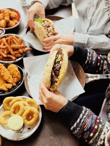 Sos meat us gold, sałata, cebula, pomidor, ogórek szewdzki, sos serowy, chrupiący kurczak, nachosy, boczek