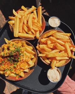 Frytki z sosem serowym, boczkiem i szczypiorkiem